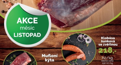 Listopadová akční nabídka na Vás čeká.  Zastavte se u nás na prodejně. Srnčí kýta - 490 Kč/kg Mufloní kýta - 299 Kč/kg Šunková klobása se zvěřinou - 218 Kč/kg Jemná paštika s brusinkou - 64 Kč/kg