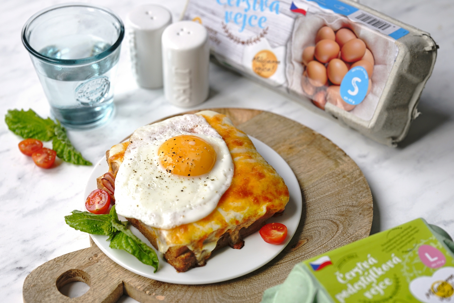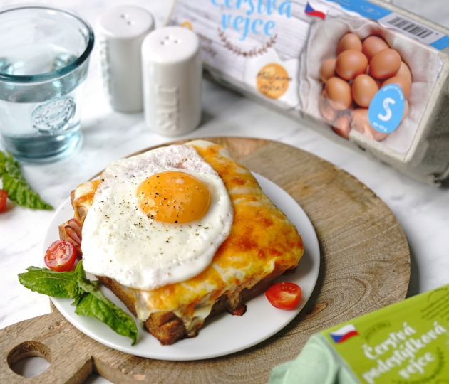 Nakonec osmažte z vajec na kousku másla volská oka, obsolete je a opepřete a na každý hotový toast je položte.