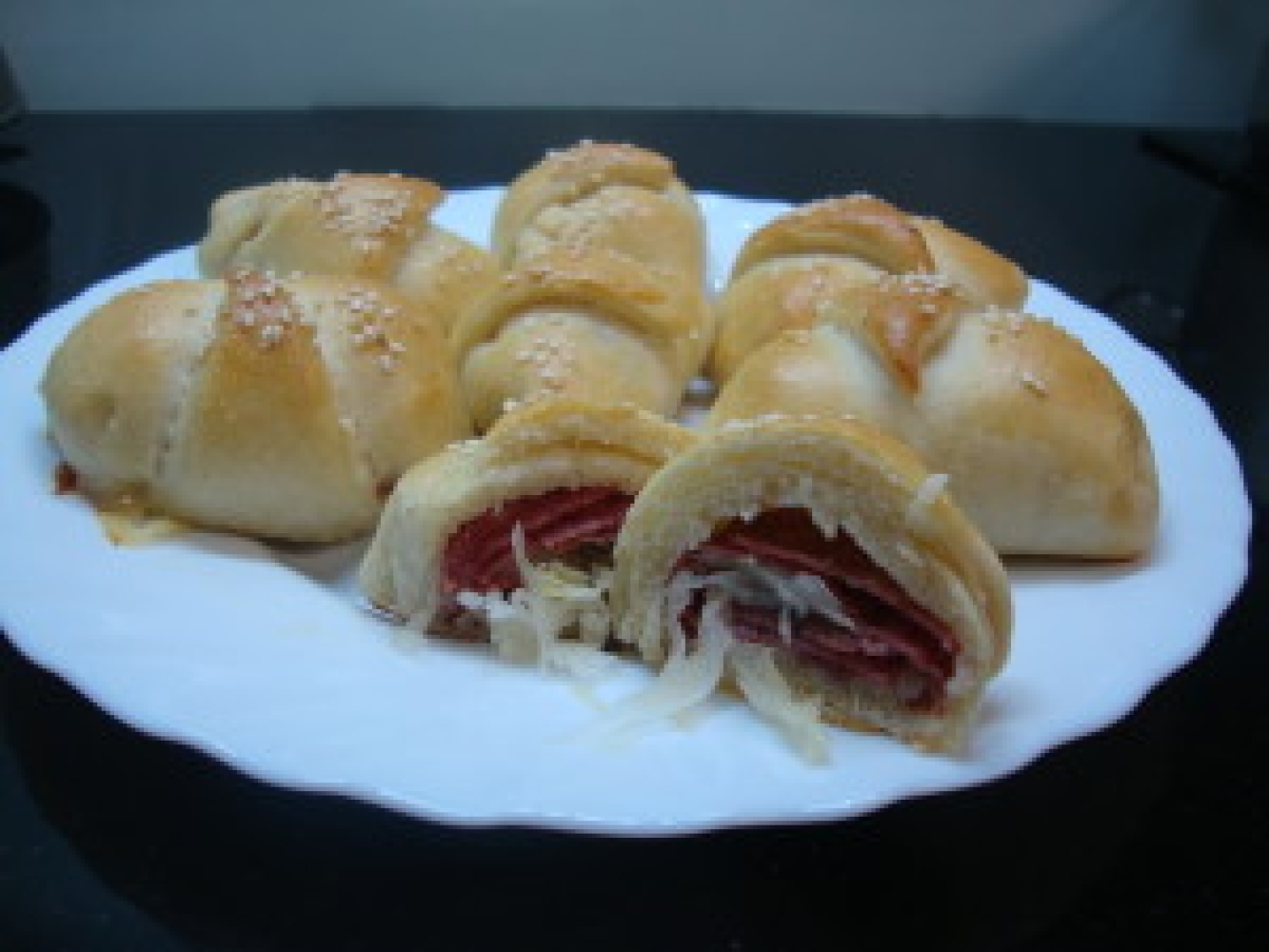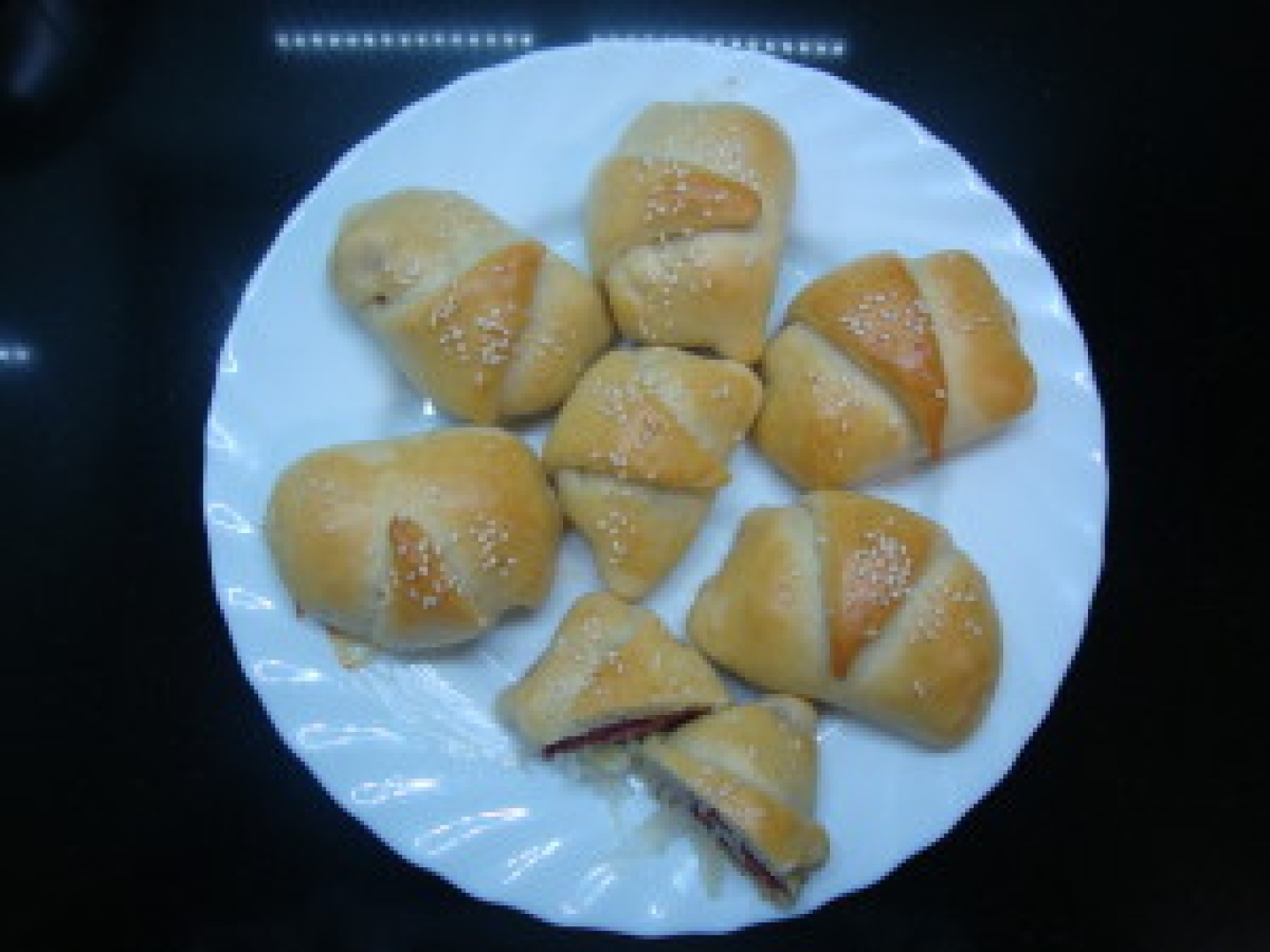 Vykynuté těsto rozdělíme na 5 dílů, z každého dílu vyválíme kulatou placku a tu rozdělíme na osminky. Vznikne nám 8 delších trojúhelníků. Na každý trojúhelník položíme náplň. Začínáme že širší strany (jakoby z obvodu placky), vnější růžky přetáhneme přes náplň, aby při pečení zbytečně nevytékala a srolujeme. Potřeme žloutkem (lze i celým rozšlehaným vajíčkem), posypeme sezamem a pečeme na 200 °C do růžova. Dobrou chuť!