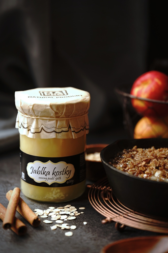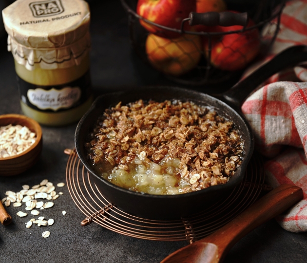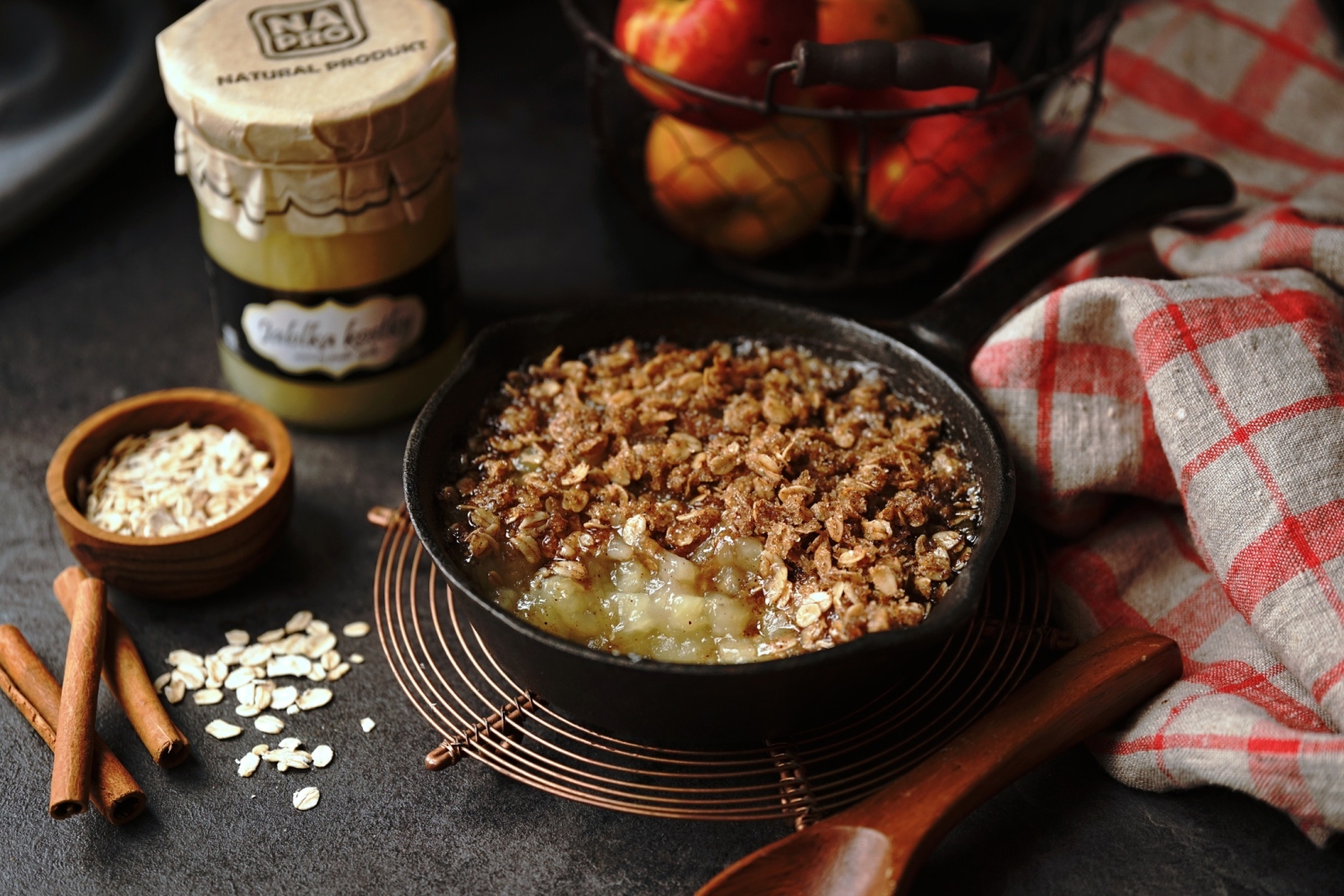 Jablka vylijte na malou litinovou pánev nebo do zapékací mísy a přidejte navrch dribenkovou vrstvu. Pečte cca 20 minut dozlatova.
