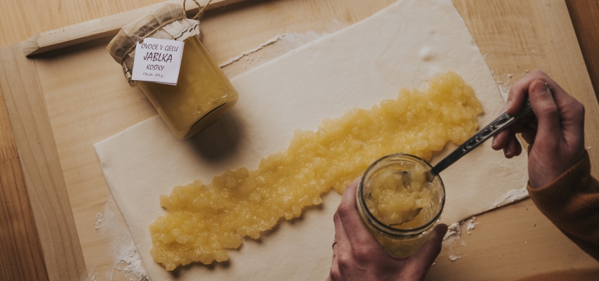Jablka vylijte na malou litinovou pánev nebo do zapékací mísy a přidejte navrch dribenkovou vrstvu. Pečte cca 20 minut dozlatova.