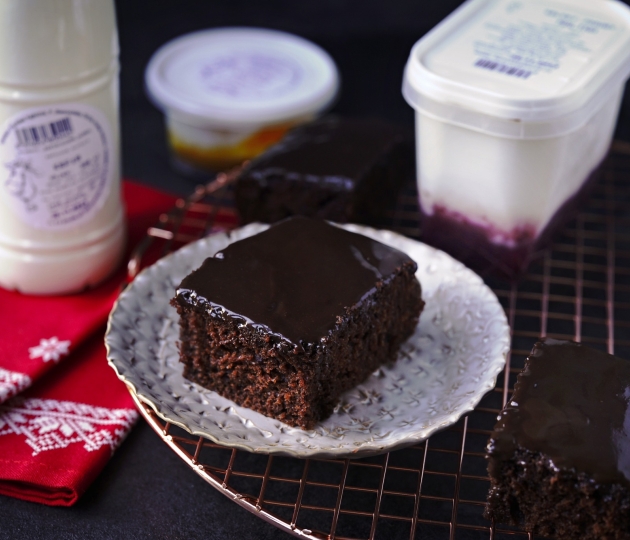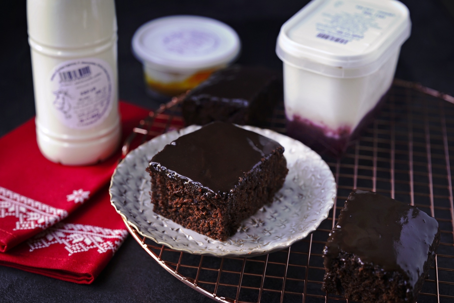 Nyní elektrickým šlehačem postupně zašlehejte sypké suroviny do tekuté směsi. Hotové těsto vlijte na máslem vymazaný a hrubou moukou vysypaný plech či pekáč (ideálně cca 23 × 34 cm) a dejte péct do předehřáté trouby asi na 50 minut. Po upečení nechte zcela zchladnout.