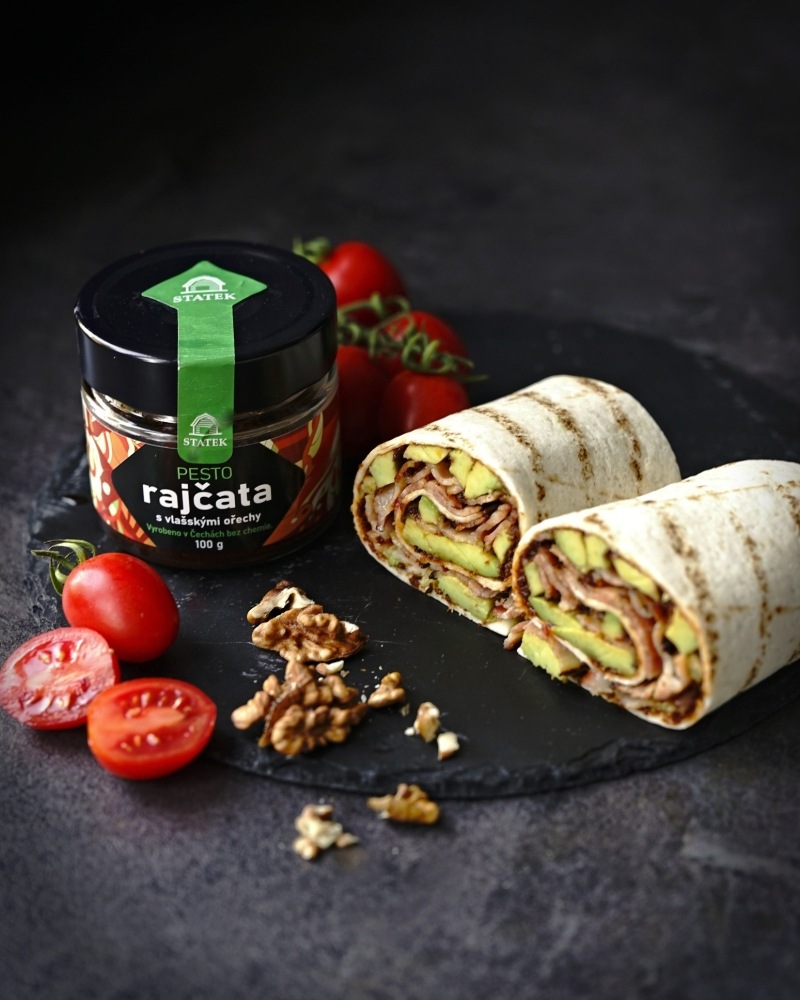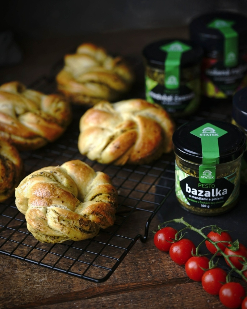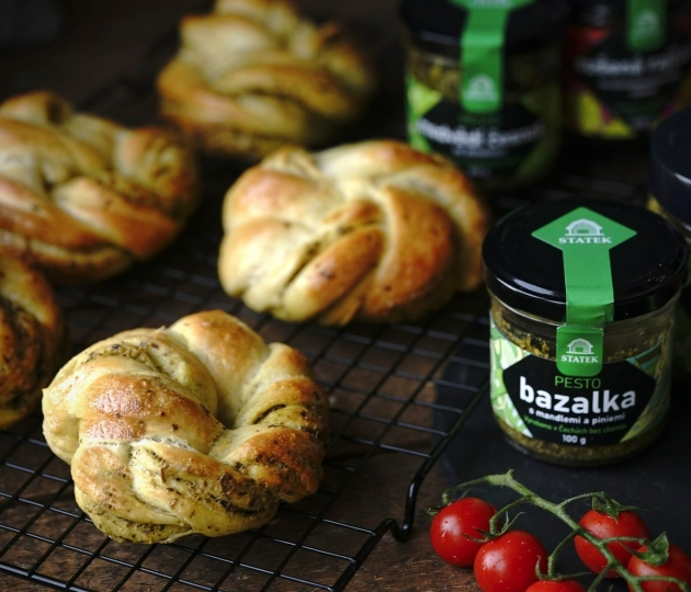 Vykynuté těsto na válu rozdělte na 6 stejných částí. Každou prsty roztáhněte do tvaru oválu. Pomažte vrstvou pesta a zarolujte přes delší stranu jako roládu. Tu rozkrojte podélně napůl a oba vzniklé cípy zamotejte do sebe a ze vzniklého “copánku” vytvořte uzel. Všechny uzly položte na plech s pečícím papírem, přikryjte utěrkou a nechte ještě cca 20-30 minut dokynout. Pak je pomašlujte rozšlehaným vejcem a dejte je péct do předehřáté trouby na 180 stupňů cca 25 minut dozlatova.