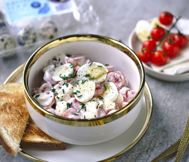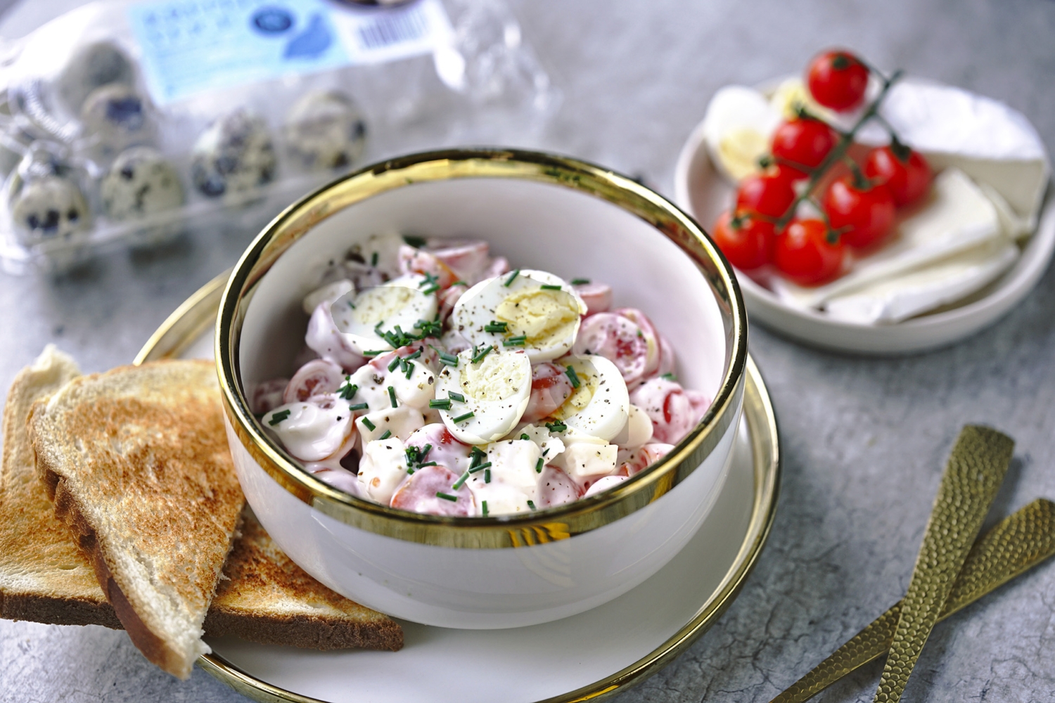 Zchladlá uvařená vejce nakrájejte na poloviny a hermelín nakrájejte na malé kostičky, jarní cibulky nasekejte. Pak vše smíchejte s rajčaty a majonézou.