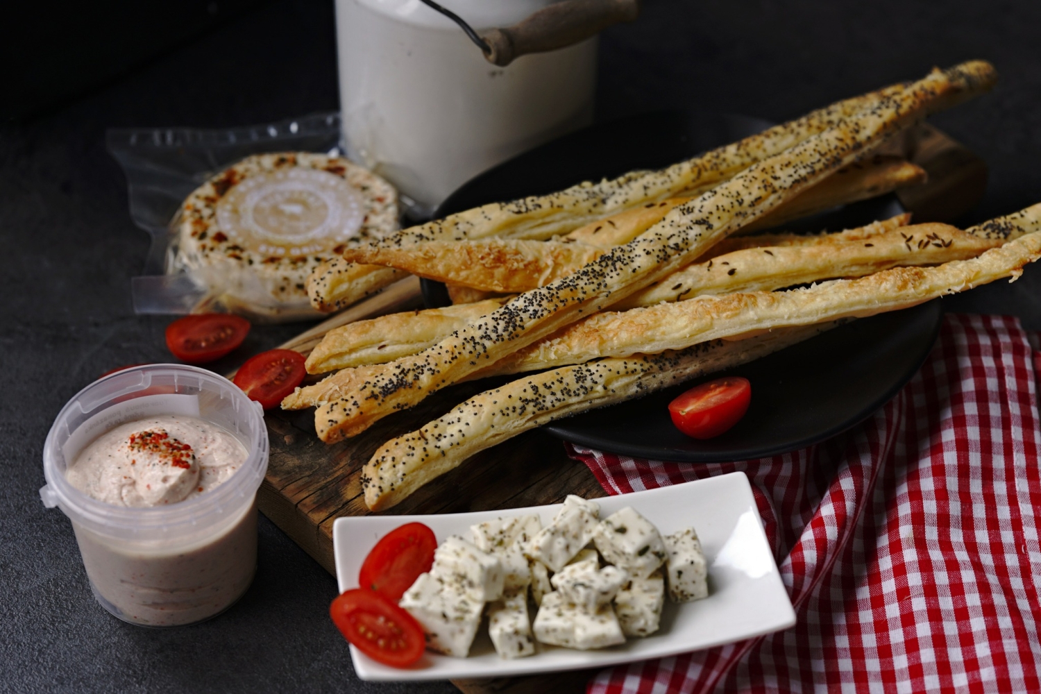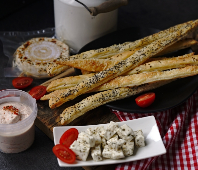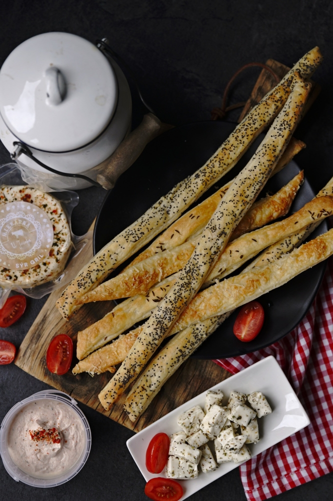 Poté ho na pomoučeném válu rozválejte na tenkou placku a tu pomocí válečku opatrně přeneste na plech s pečícím papírem. Až zde ji rádlem nakrájejte na tenké tyčinky. Ty pomašlujte studenou vodou, ještě lehce osolte a posypte dle chuti mákem, sezamovými semínky, kmínem nebo strouhaným parmazánem.