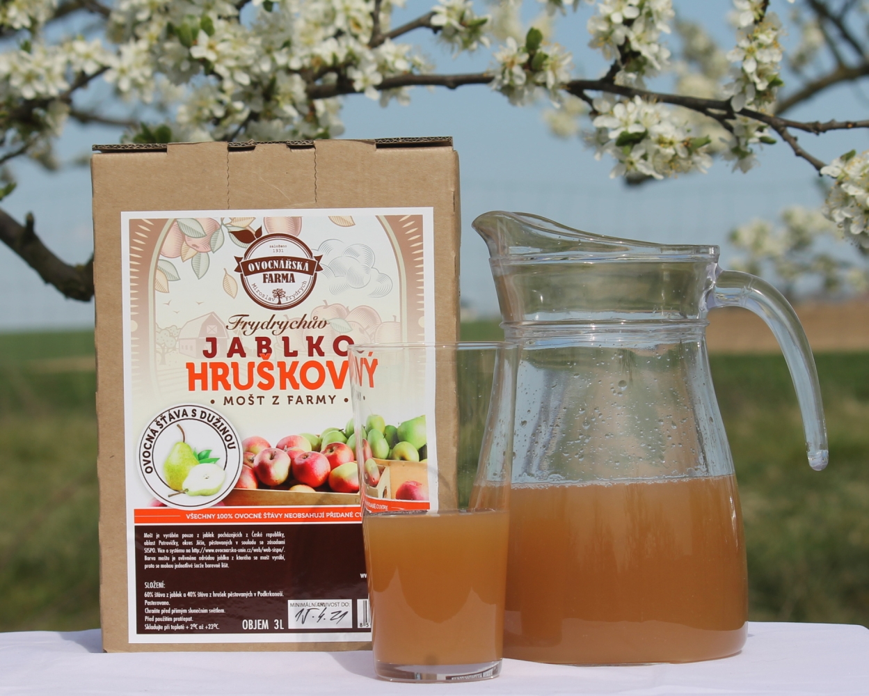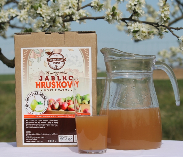 Náš jablko hruškový mošt je dodáván v 3 litrovém obalu bag–in–box neboli „sáček v krabici“, který představuje moderní a efektivní způsob balení nápojů. Jedná se o vakuově uzavřený, měkký a pružný sáček v kartonové krabici. Aby bylo zabráněno zpětnému pronikání vzduchu, je sáček opatřen kohoutkem.