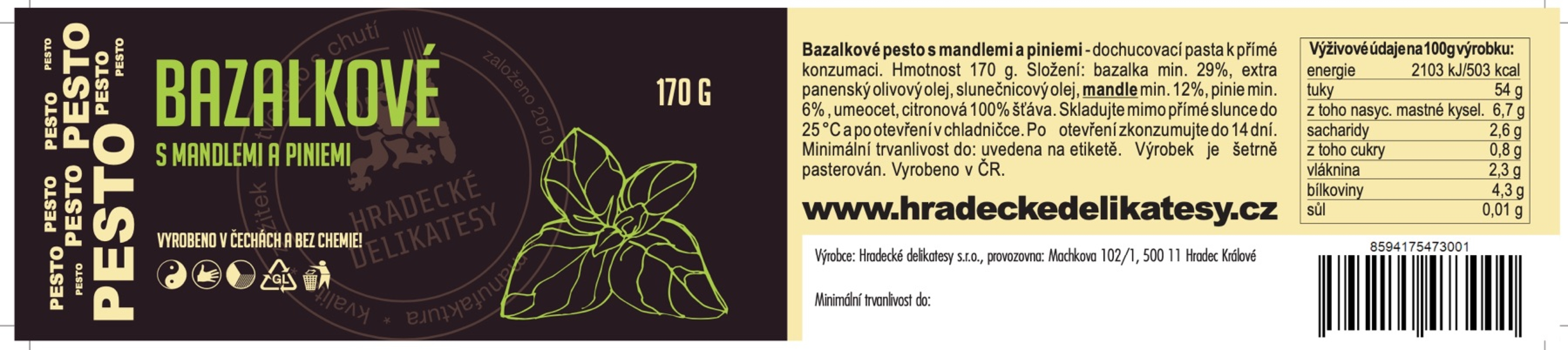 Bazalkové pesto s mandlemi a piniemi — dochucovací pasta k přímé konzumaci. Hmotnost 170 g. Složení: bazalka min. 29%, extra panenský olivový olej, slunečnicový olej, mandle min. 12%, pinie min. 6% , umeocet, citronová 100% šťáva. Skladujte mimo přímé slunce do 25 °C a po otevření v chladničce. Po otevření zkonzumujte do 14 dní. Minimální trvanlivost do: uvedena na etiketě. Výrobek je šetrně pasterován. Vyrobeno v ČR.