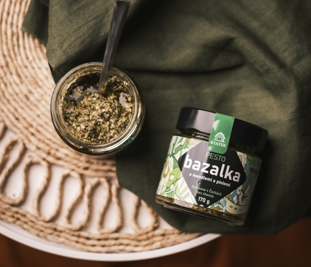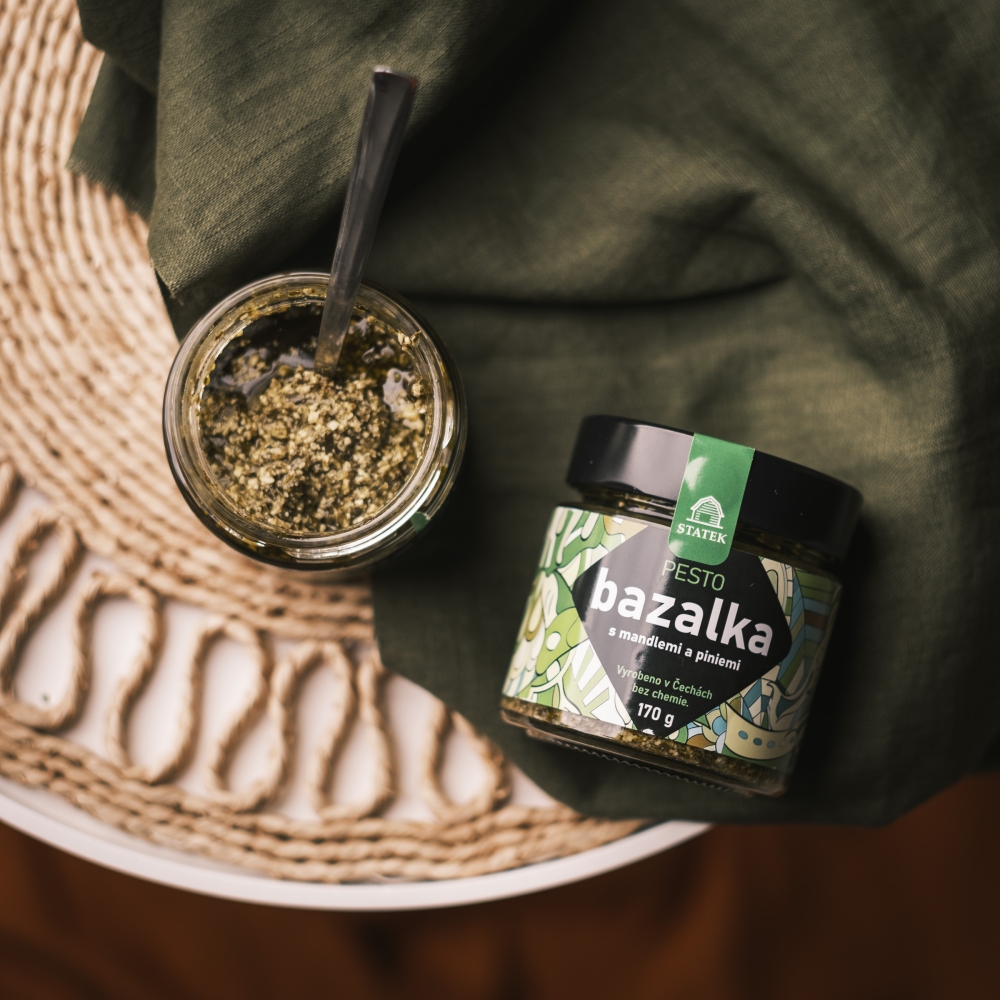 Ručně a šetrně vyráběné pesto z bazalky v Čechách z české bazalky, je bez chemických konzervantů, aromat, lepku a GMO.