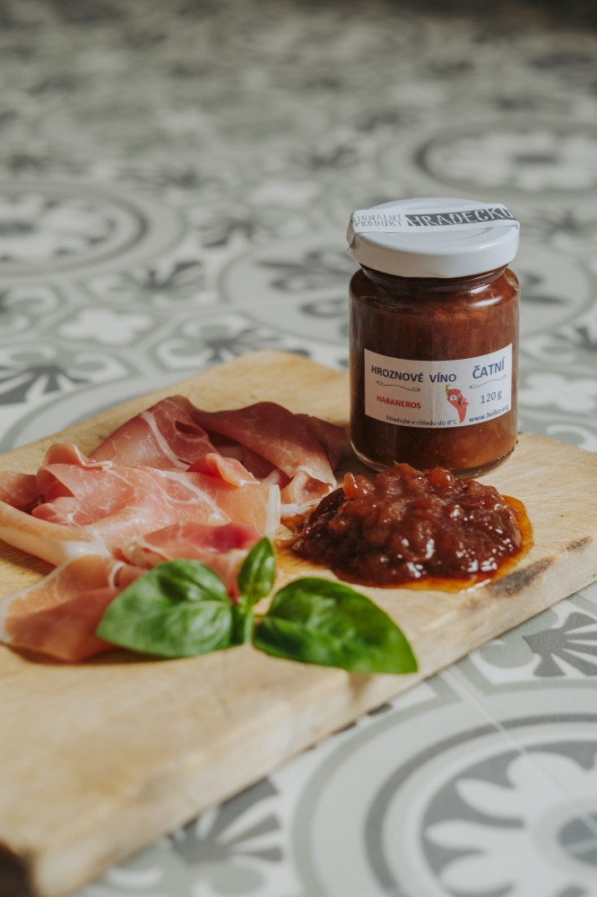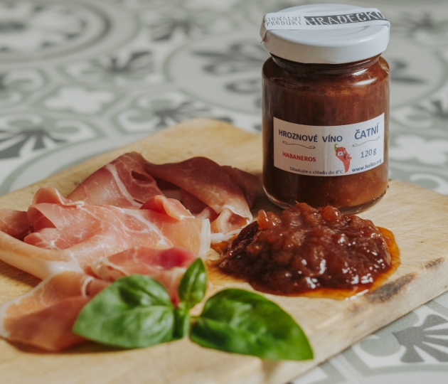 ČATNÍ ze zkaramelizované cibule, vinného octa a hroznového vína bez pecek. Pro zvýraznění chuti je přidána chilli paprička Habaneros s pálivostí SHU 500tis. DOPORUČENÉ POUŽITÍ: Ideální jako omáčka ke steakům, pikantním sýrům aj. Do dresinků, omáček aj.