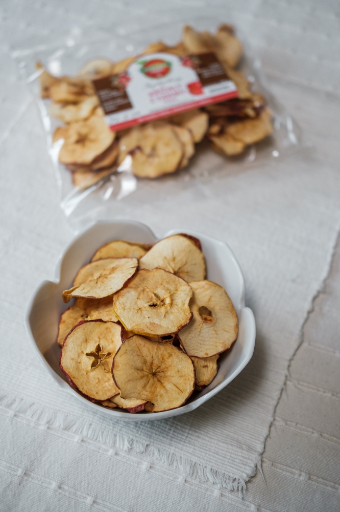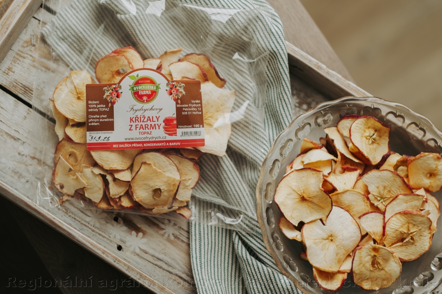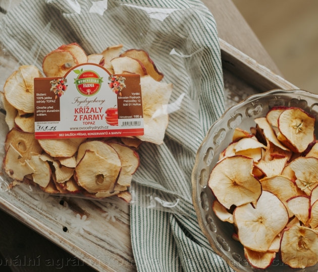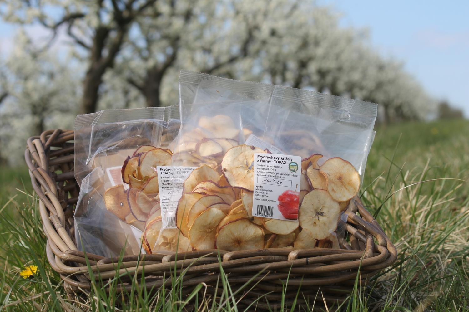 Sušená jablka výrazné svěží chuti, bez dalších přísad, konzervantů a barviv. Baleno v sáčku po 100 gramech.
