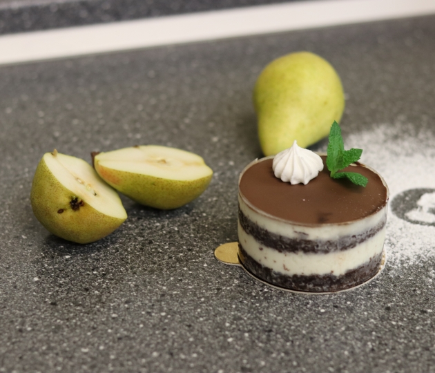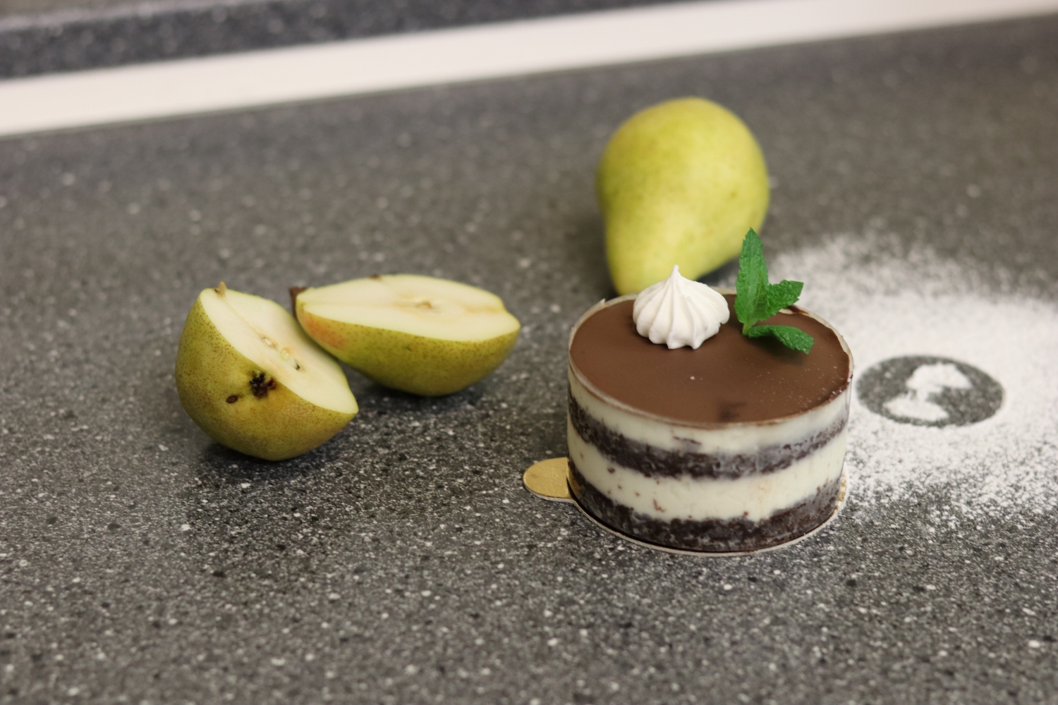 Dortíky jsou složené z vrstveného nadýchaného kakaového korpusu, zvlhčené rumovou příchutí s jitrocelovým sirupem, proložené odlehčeným krémem ze šlehačky a mascarpone a nakládanými hruškami, zalité čokoládovou ganáží.