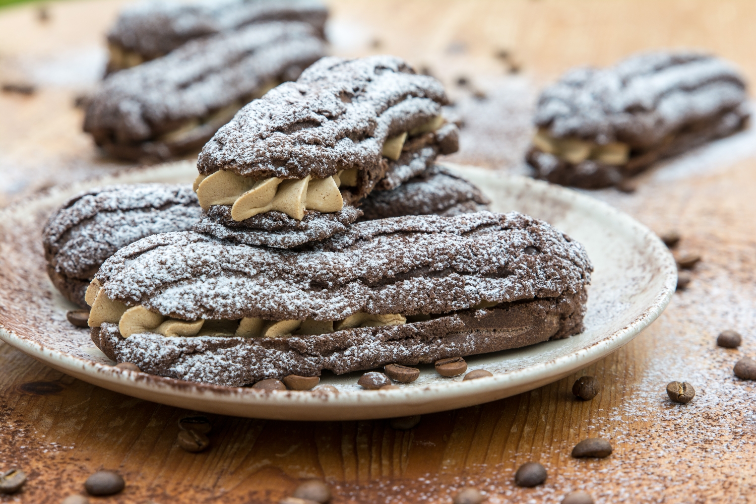 Ideální dezert do ruky ke kávě. Kakaové odpalované těsto s křupavou kakaovou vrstvou, plněné kávovým krémem ze šlehačky, bílé čokolády a rozpustné kávy.
