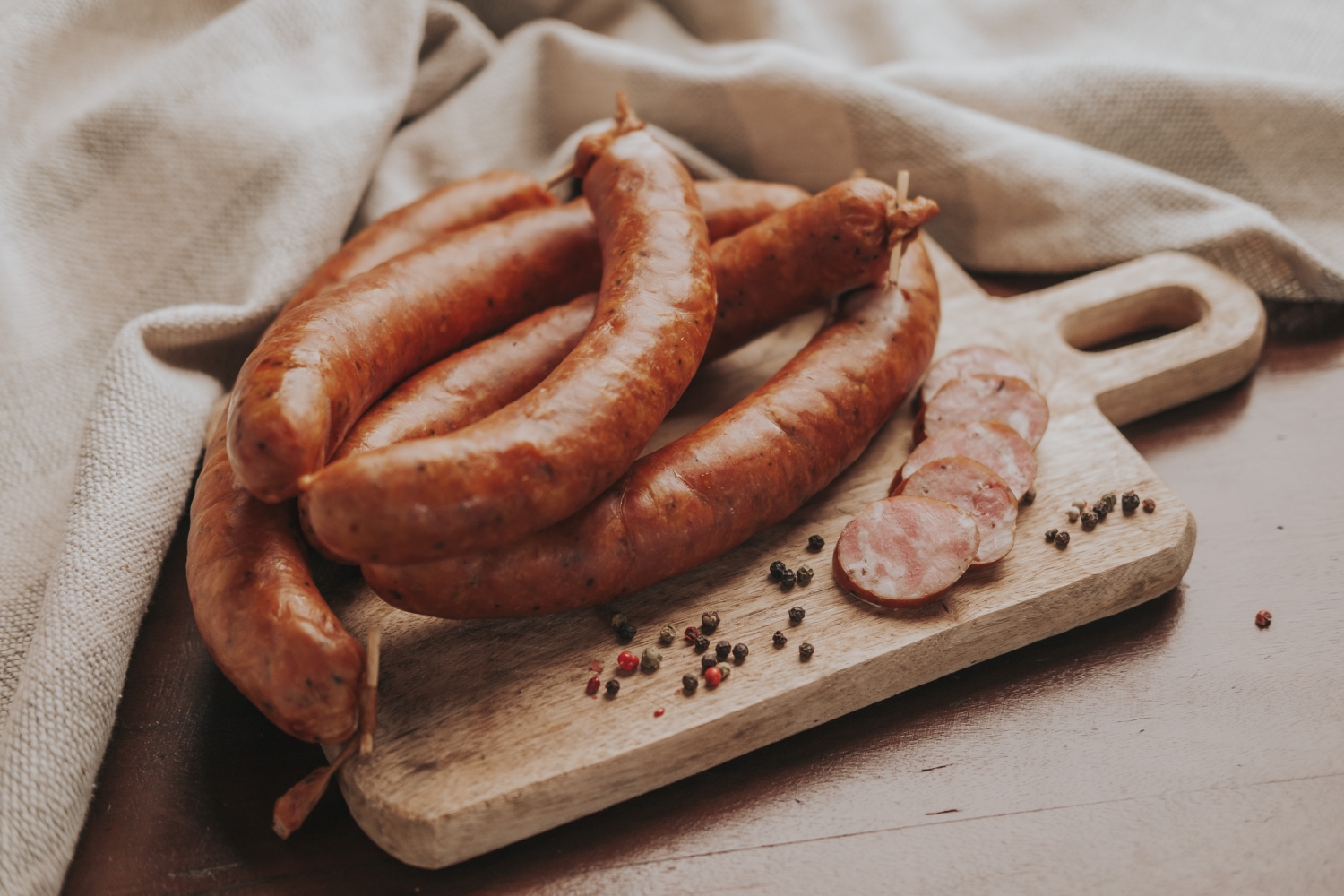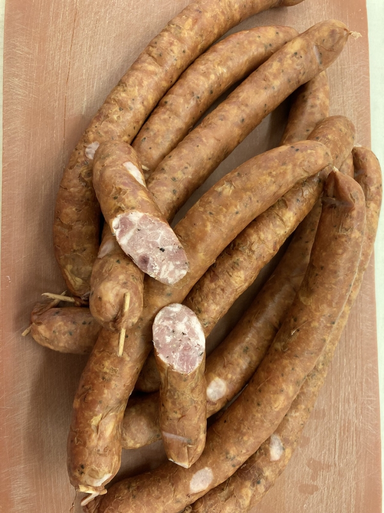 Klobása ručně přetáčená na koncích špejlována s drceným pepřem o velikosti 2-3mm zrnek.