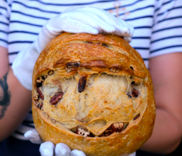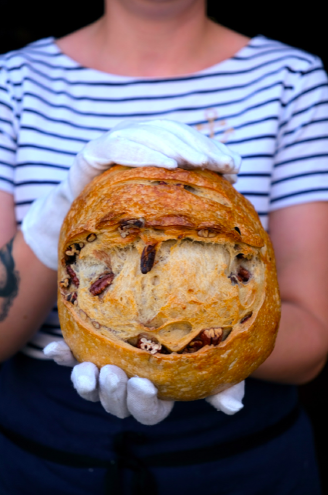 Ručně vážený a porcovaný chleba s naším kváskem je kousek, který nesmí chybět u žádné snídaně či na grilovačce. Zákazníci často píšou, že zmizí dříve, než samotné hlavní jídlo. Předem pražené ořechy přijemně rozvoní celou pekárnu vždy ve středu a v pátek, kdy u nás najdete tento speciál. Patří mezi nejprodávanější produkt po celý rok.