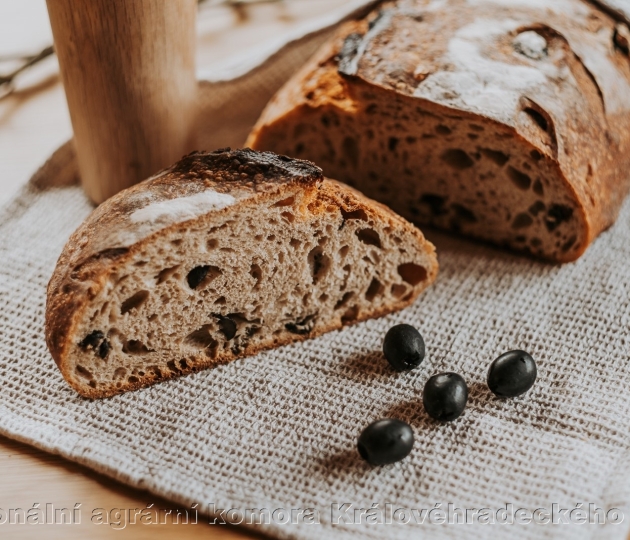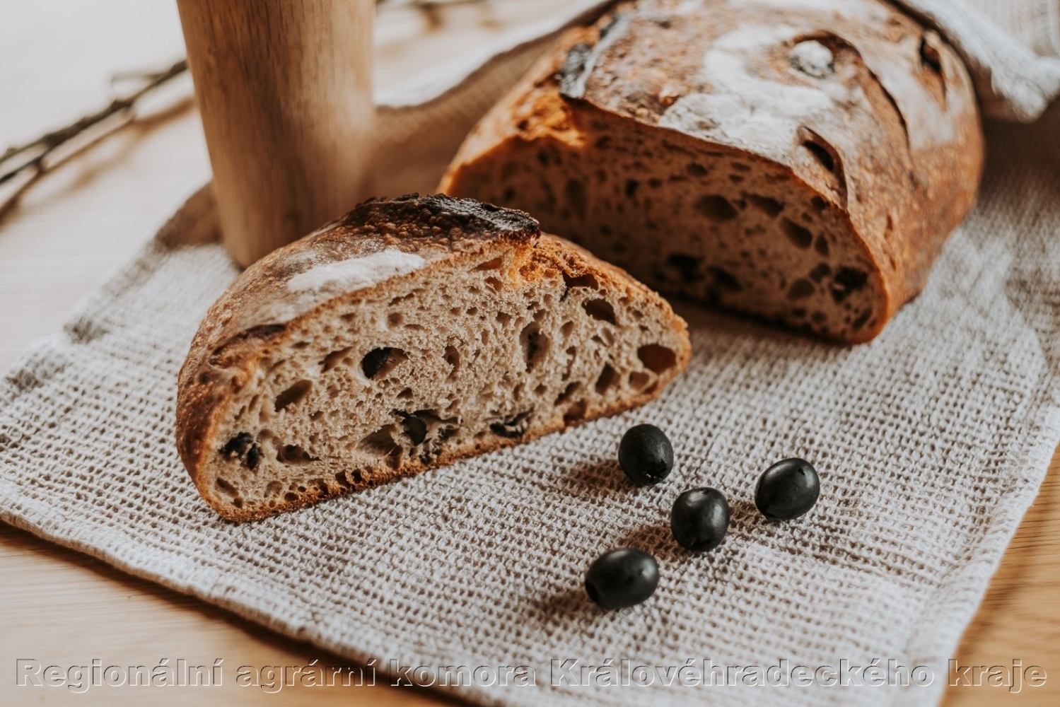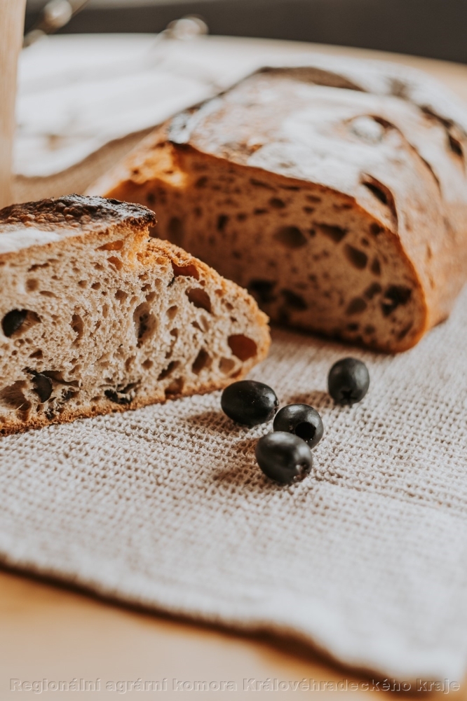 Řemeslný chléb z vlastního žitného kvásku s přidáním černých oliv a mouky od regionálního výrobce.