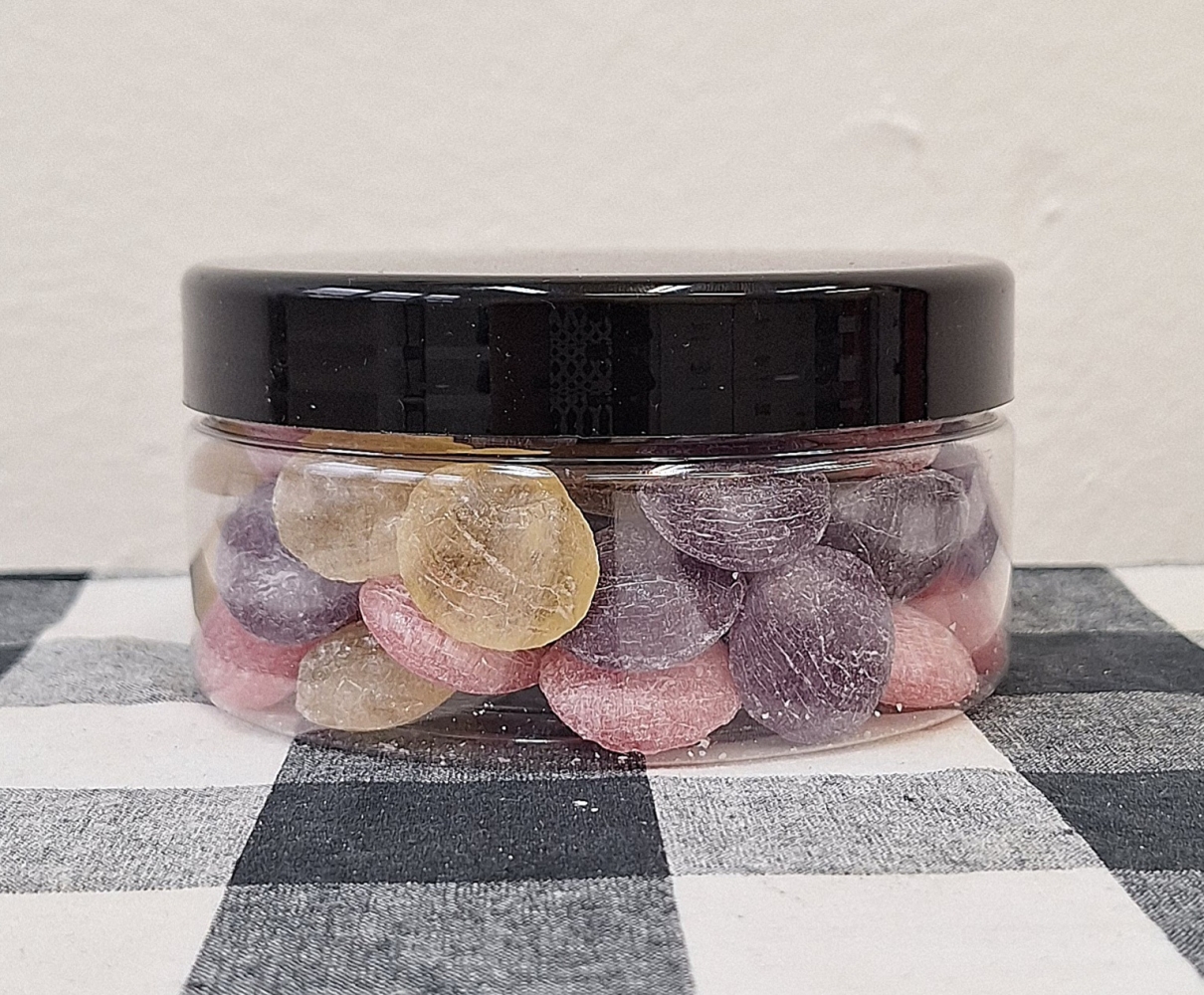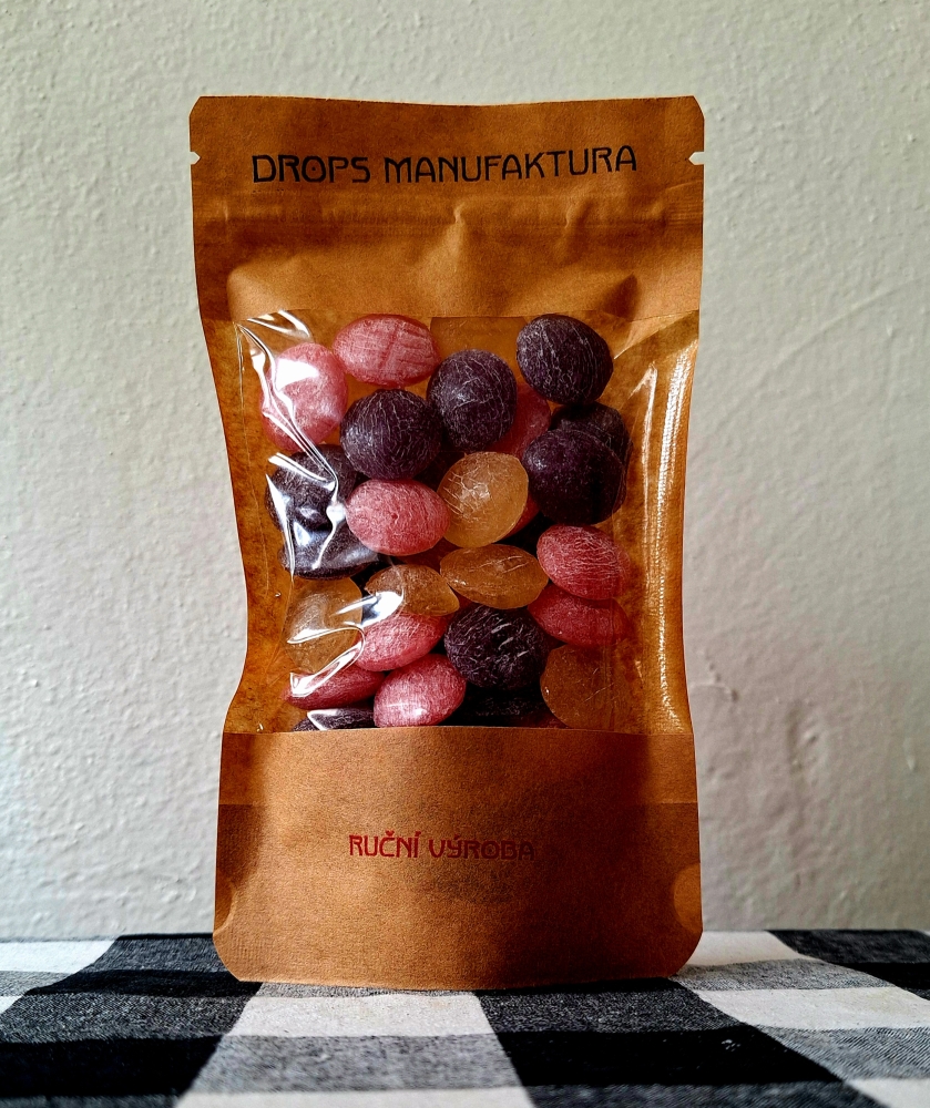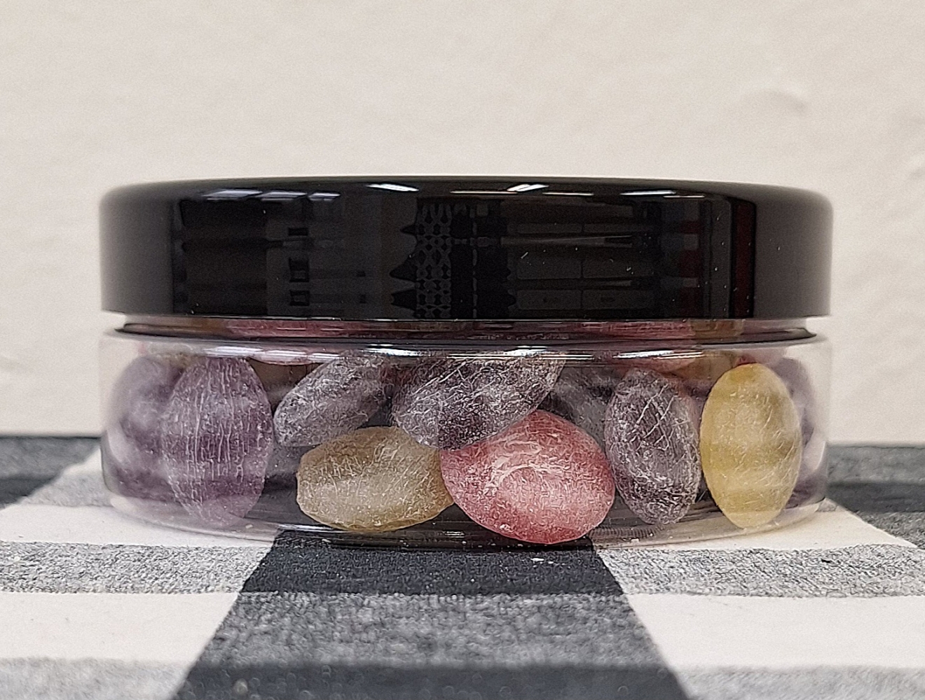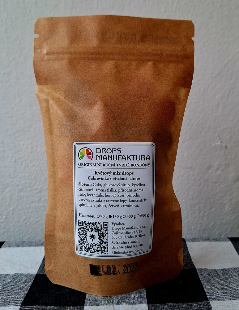 Složení: Cukr, glukózový sirup, kyselina citronová, aroma fialka, přírodní aroma růže, levandule, bezový květ, přírodní barviva extrakt z červené řepy, koncentrát spiruliny a jablka, červeň karmínová.