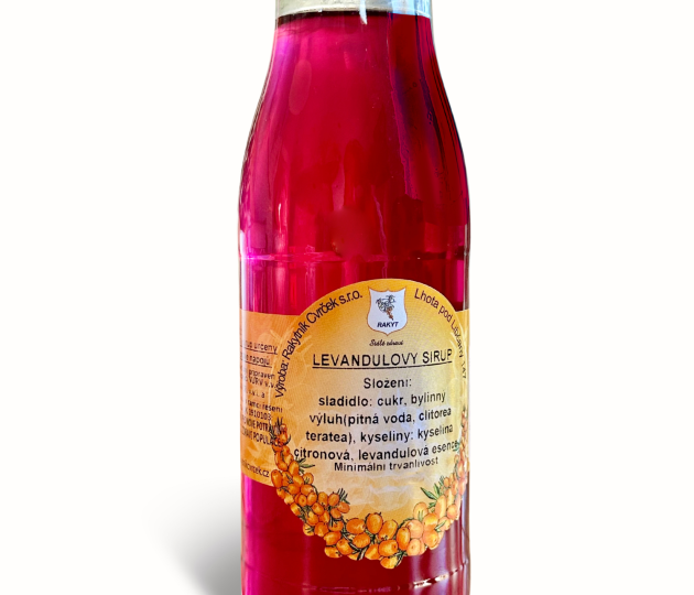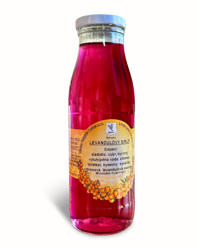 Složení: sladidlo: cukr, bylinný výluh (pitná voda, clitorea ternatea), kyseliny: kyselina citronová, levandulová esence.