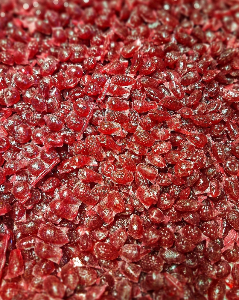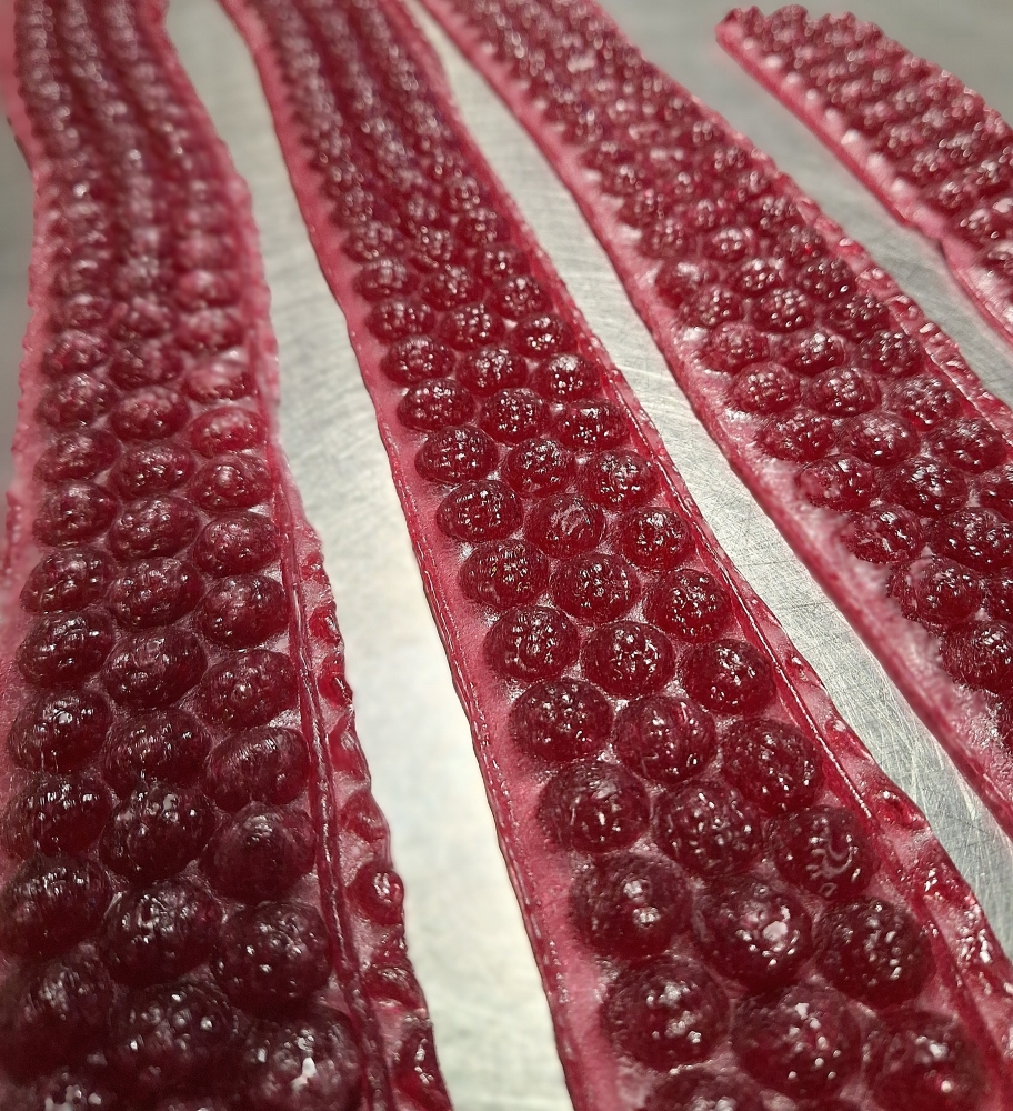 Složení: Cukr, glukózový sirup, kyselina citrónová, přírodní aroma malina, přírodní barviva extrakt z červené řepy, koncentrát spiruliny a jablka