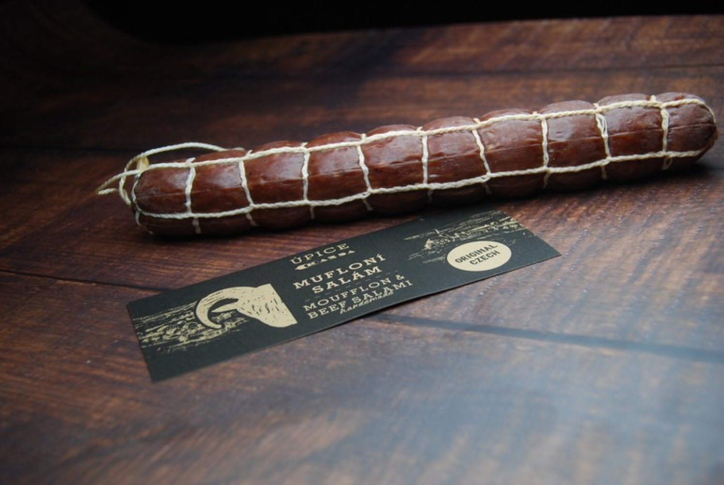 Na 100g výrobku bylo použito 162 kg masa: Mufloní maso 51 %, hovězí maso 49 %. HOŘČICE, jedlá sůl, směs koření, konzervant E 250, antioxidant E 316. Bez lepku.