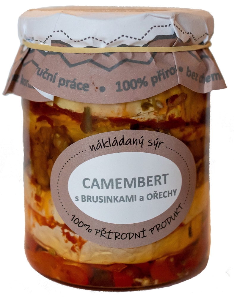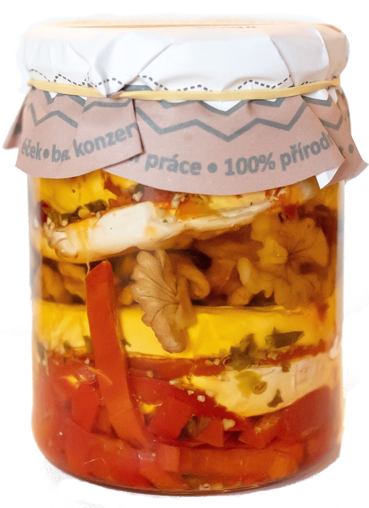 Složení: plísňový sýr 2 x 100g, červená paprika , ořechy , paprikové floky , čerstvé brusinky , směs koření, koriandr , pískavice , rostlinný olej , bazalkové pesto v náplni , olej můžete po zcezení použít do salátů či základů do omáček nebo na nakládání nejen masa ,