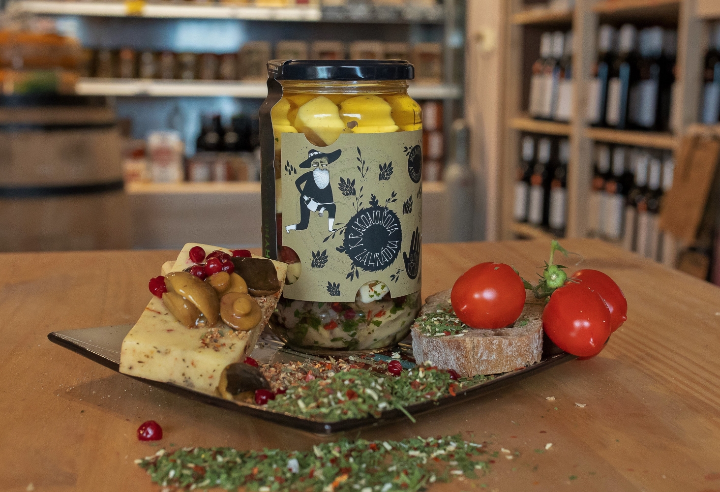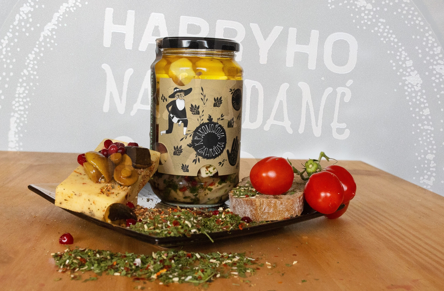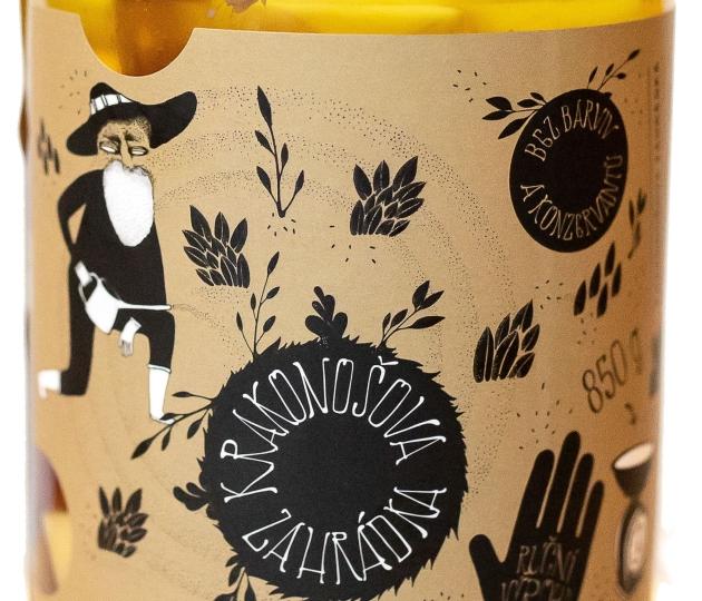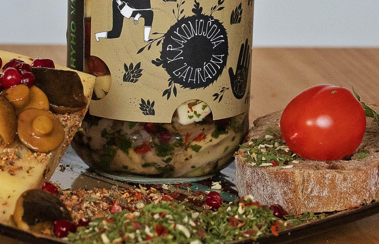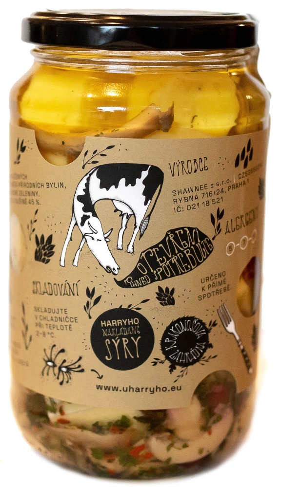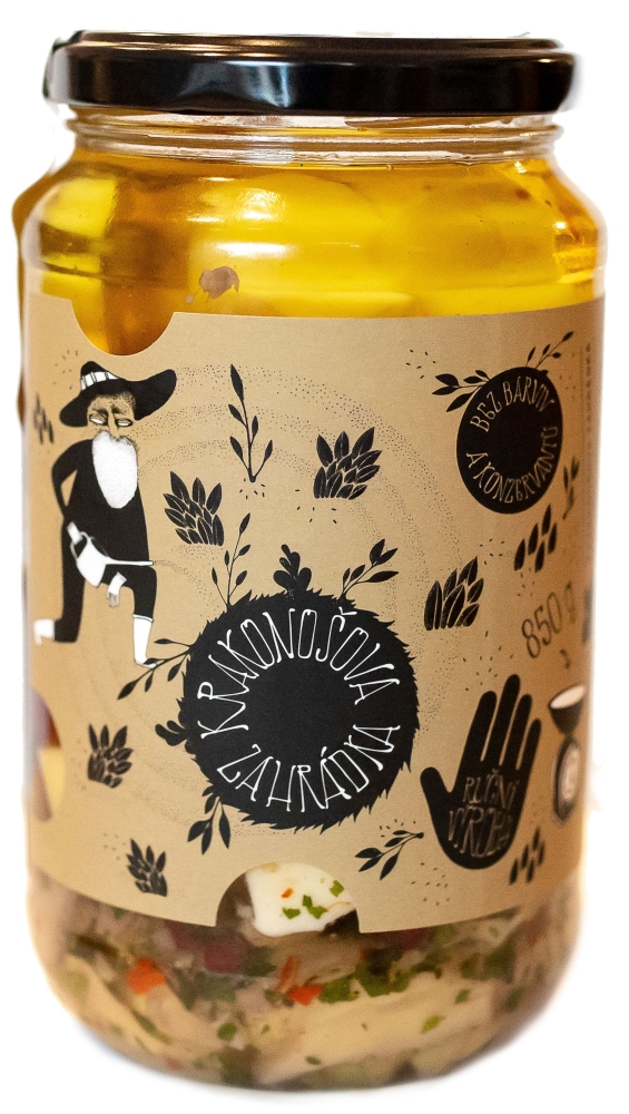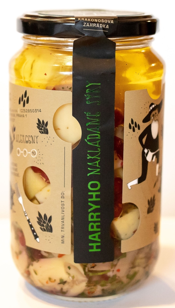 Ručně nakládaný sýr Krakonošova zahrádka je excelentní delikatesou nejen k pivu a vínu. Složení: vybraný mix sýru Excelent bazalka + rajče cca 260g, grilované žampiony, brusinky, směs koření Krakonošova zahrádka, rostlinný olej. Olej můžete po scezení použít do salátů či základů do omáček nebo na nakládání nejen masa.