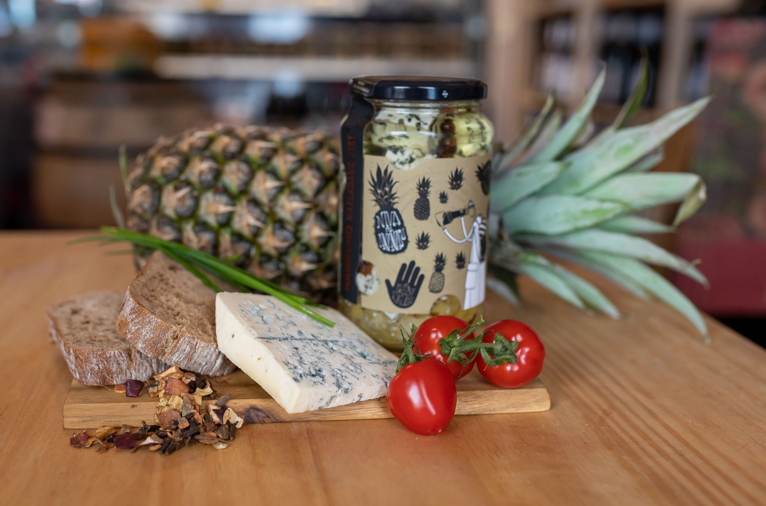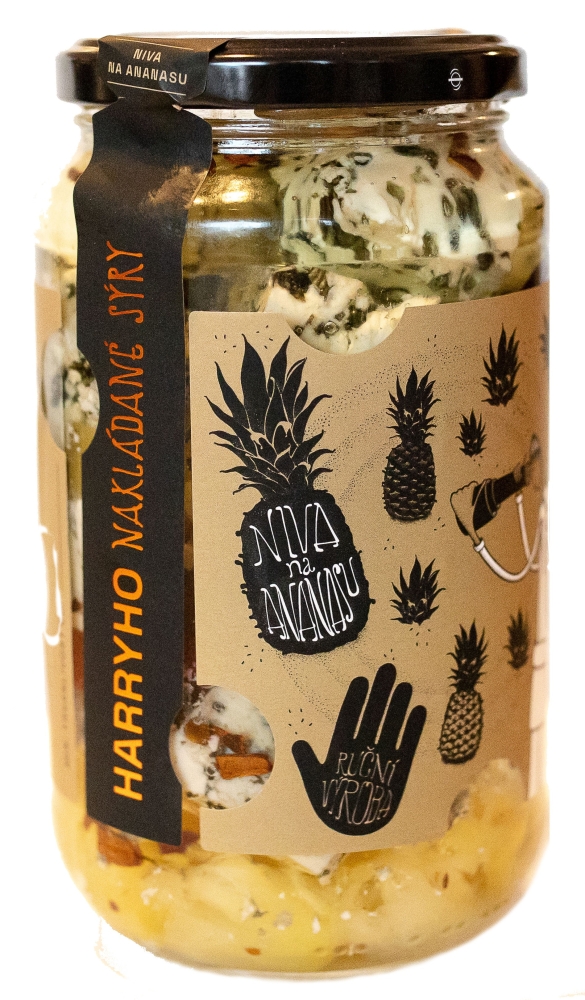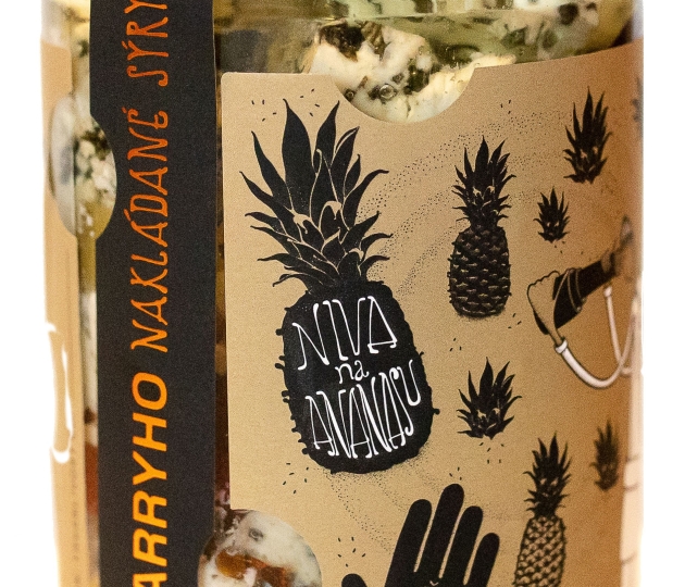Ručně nakládaný sýr Niva na ananasu je excelentní delikatesou nejen k pivu a vínu. Složení: vybraný mix sýrů Niva kosčky cca 260g, čerstvý ananas, brusinky, směs koření koriandr, pískavice rostlinný olej. Olej můžete po scezení použít do salátů či základů do omáček nebo na nakládání nejen masa.