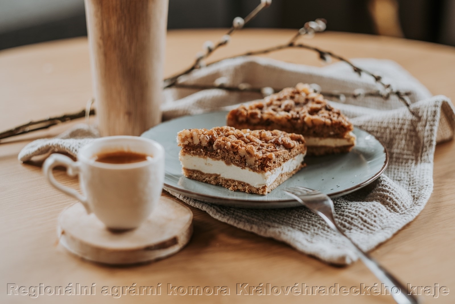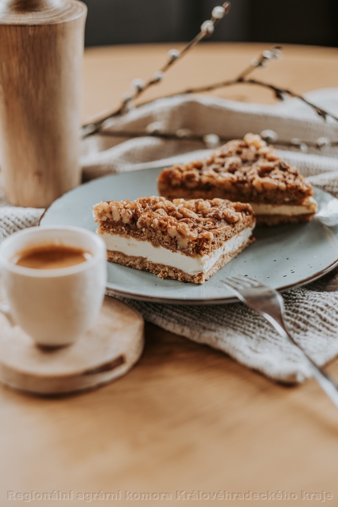 Ořechový řez s máslovou pudinkovym krémem na medovnikovem korpusu s krokantem z vlašských ořechů.