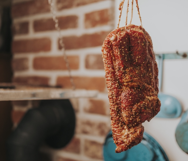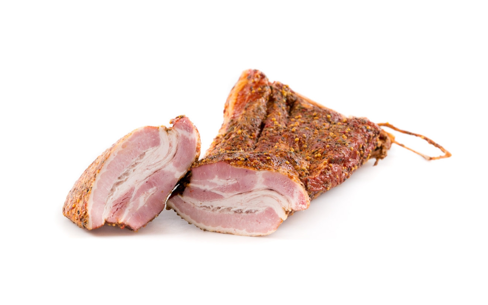Pečlivě vybrané části vepřového boku obalíme v koření s hořčičným semínkem a jemně vyudíme. Pikantní bok si skvěle rozumí se sklenkou dobrého vína nebo s pivem, případně jen tak sbalený na cesty v batohu. My ho máme nejraději nakrájený na prkénku na tenké plátky, kde se rozvine jeho příjemná vůně.