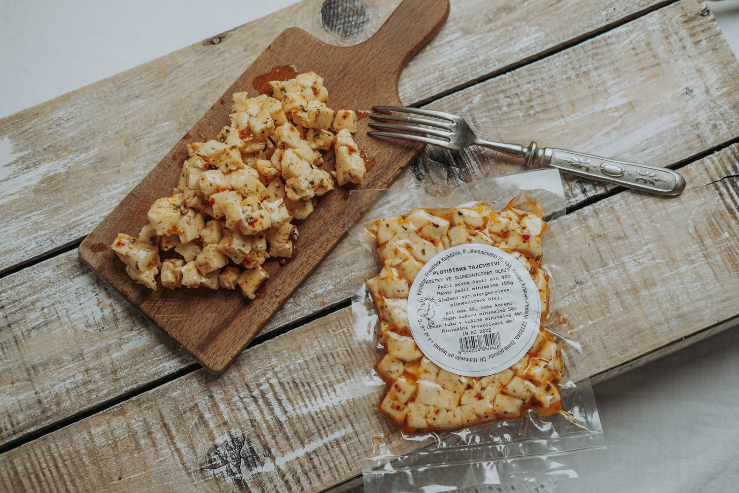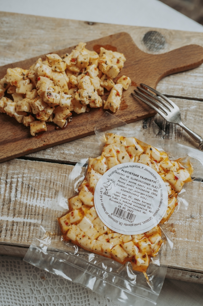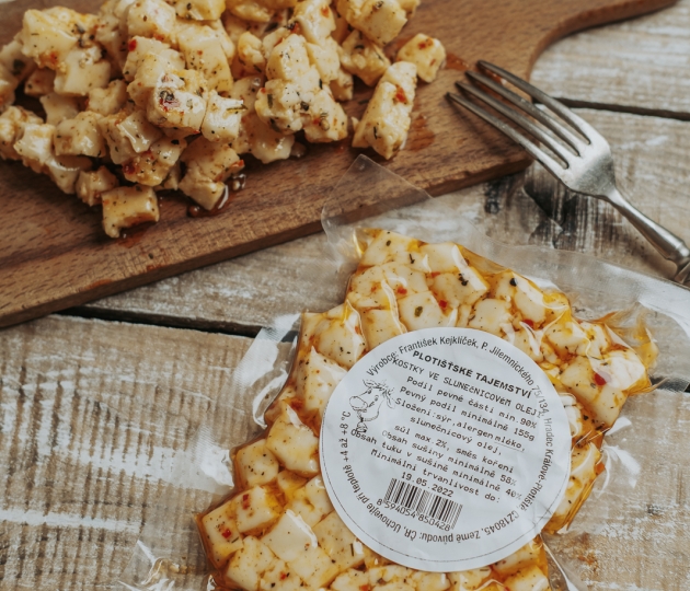Nakládané kostky sýra ve slunečnicovém oleji s kořením. Sýr je vakuově balen. Sýr získal ocenění Regionální potravina.