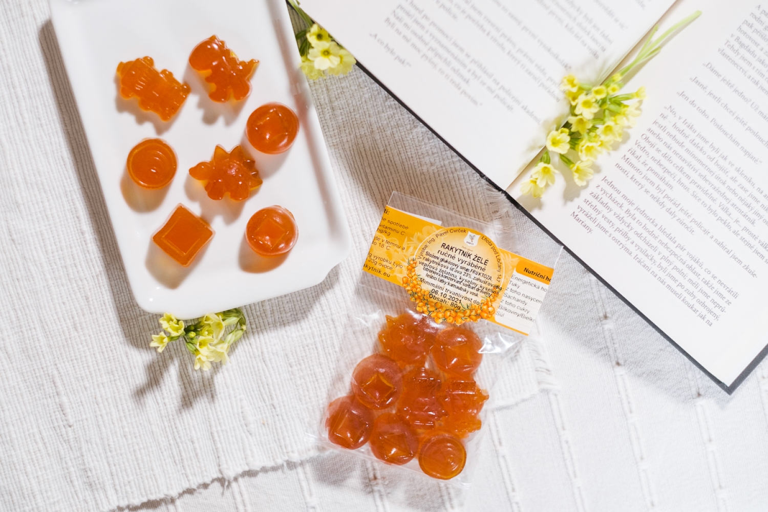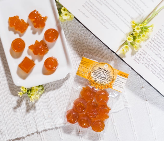Při ruční výrobě želé používáme rakytníkovou šťávu a vysoce kvalitní želatinu, která je zdrojem bílkovin. Želé má příjemnou ovocnou chuť, typickou pro rakytník.
