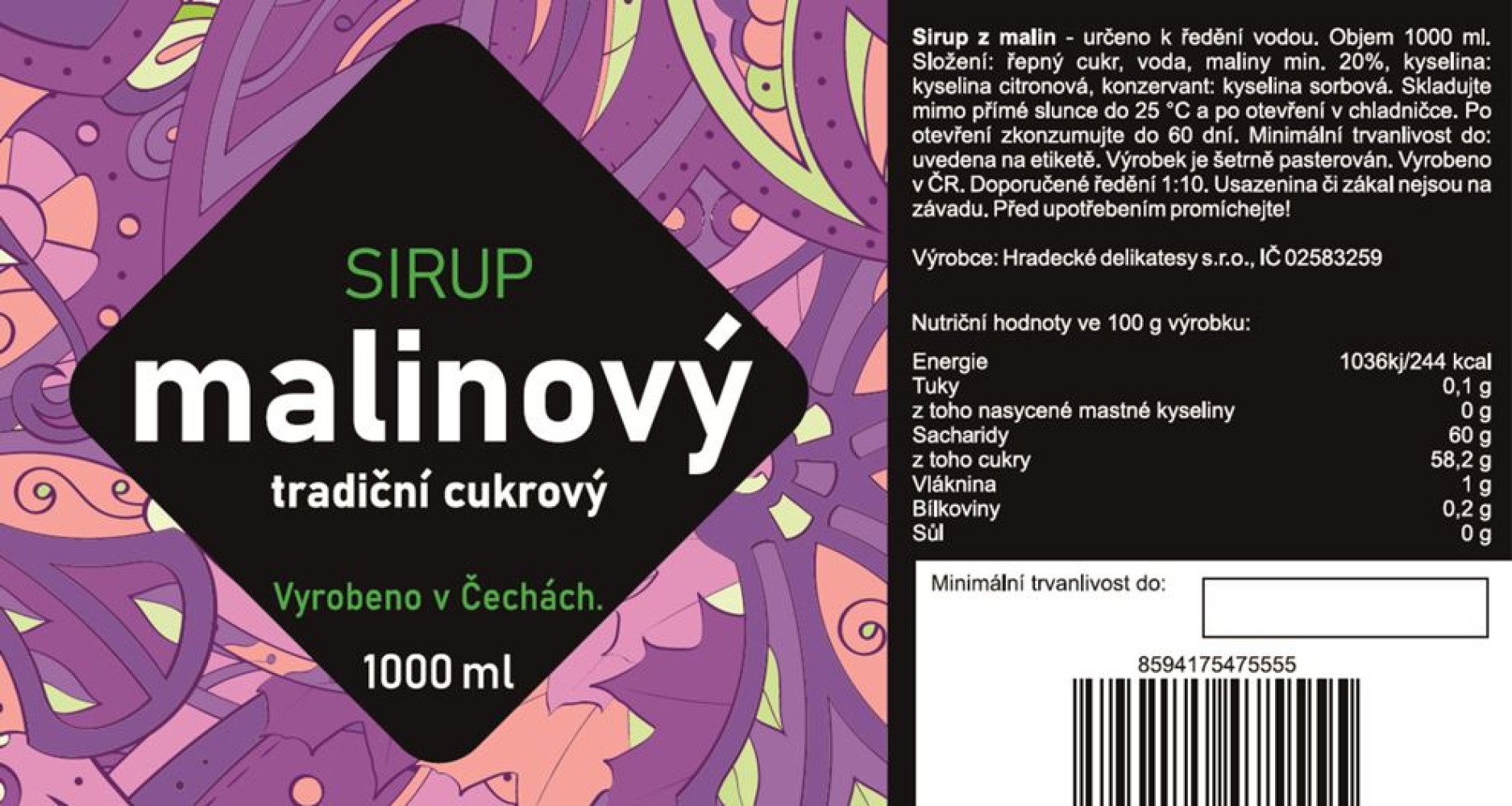 Ručně a šetrně vyráběný sirup z malin s dužninou. Vyrobeno v Čechách bez aromat. Není použit koncentrát.