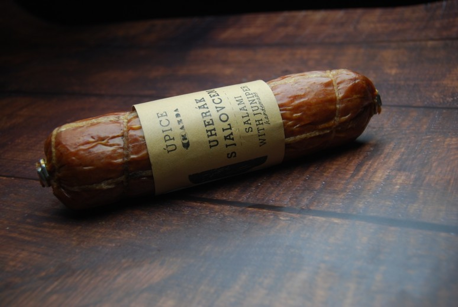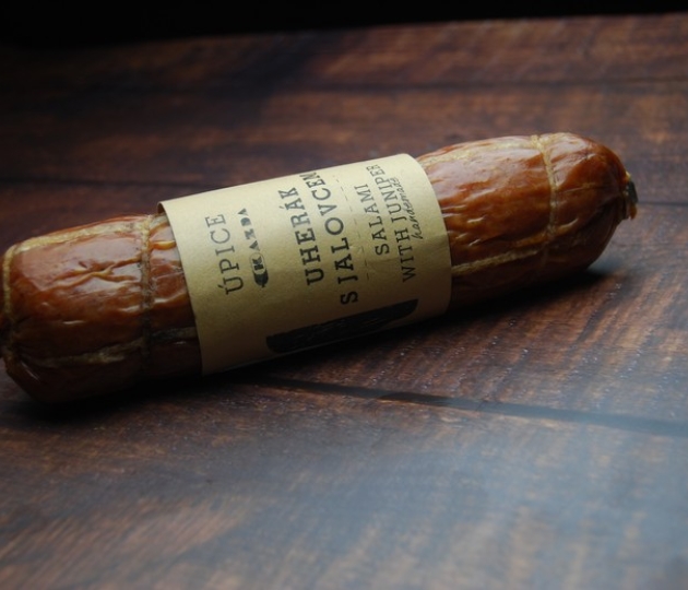 Na 100 kg hotového výrobku bylo použito 162 kg masa: 50 % vepřové maso, 50 % hovězí maso, jedlá sůl, koření, E 250 konzervant, E 316 antioxidant, jalovec (1 %), HOŘČICE, E 120,E162 barvivo, droždí, kouřové aroma, startovací kultura.Bez lepku