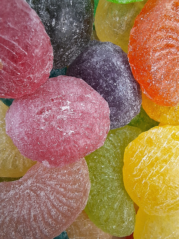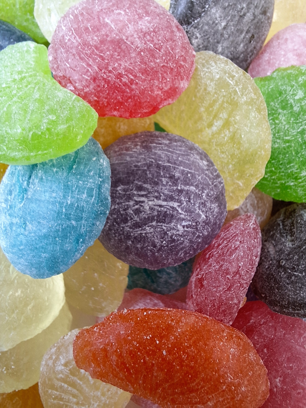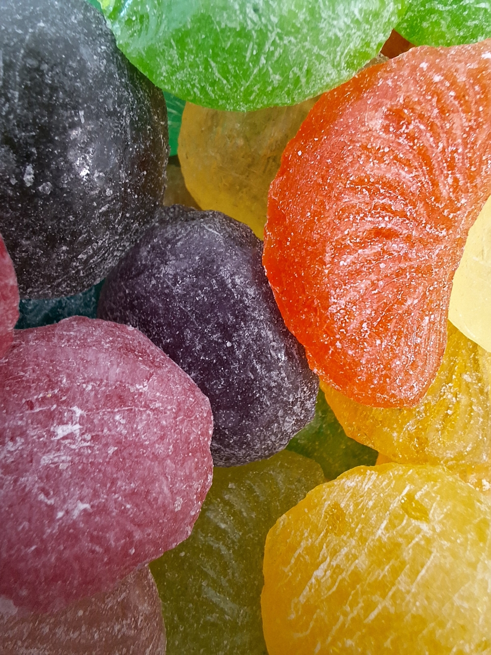 Složení: Cukr, glukózový sirup, kyselina citronová, přírodní aroma citron, pomeranč, jahoda, malina, broskev, višeň, zelené jablko, mandarinka, limeta, yuzu, pomelo, grapefruit, anýz, eukalyptus, máta peprná, lékořice, růže, levandule, bezový květ, citronová tráva, cola, jedle, šalvěj, aroma fialka, přírodní barviva koncentrát ze světlice barvířské, citronu, spiruliny a jablka, extrakt z červené řepy a kurkumy, červeň karmínová, rostlinná uhlíková čerň.