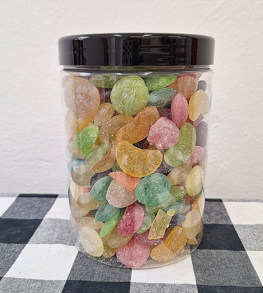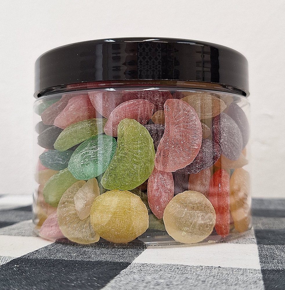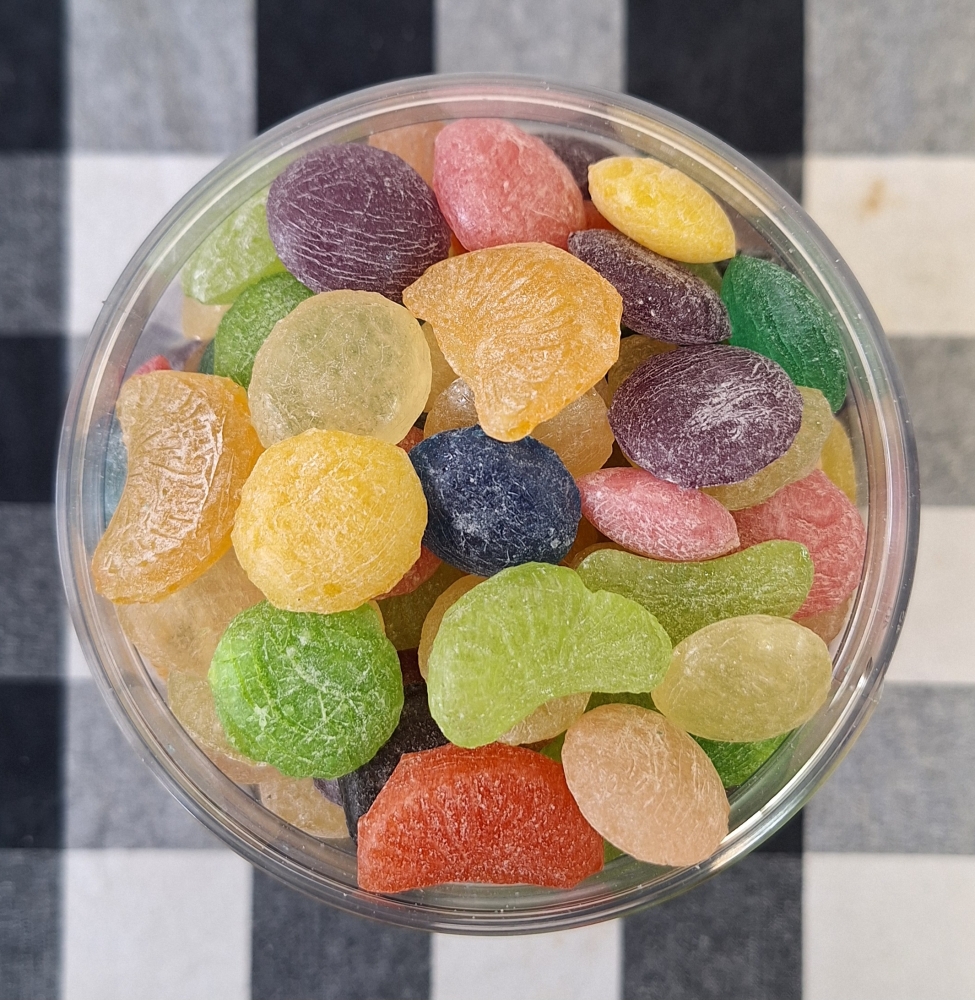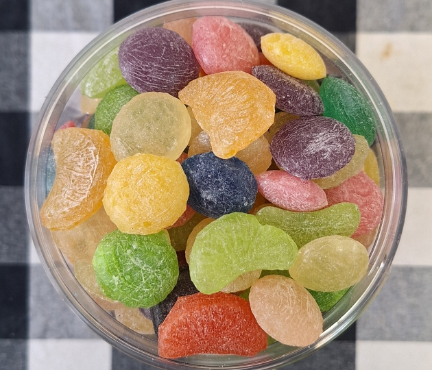 Složení: Cukr, glukózový sirup, kyselina citronová, přírodní aroma citron, pomeranč, jahoda, malina, broskev, višeň, zelené jablko, mandarinka, limeta, yuzu, pomelo, grapefruit, anýz, eukalyptus, máta peprná, lékořice, růže, levandule, bezový květ, citronová tráva, cola, jedle, šalvěj, aroma fialka, přírodní barviva koncentrát ze světlice barvířské, citronu, spiruliny a jablka, extrakt z červené řepy a kurkumy, červeň karmínová, rostlinná uhlíková čerň.