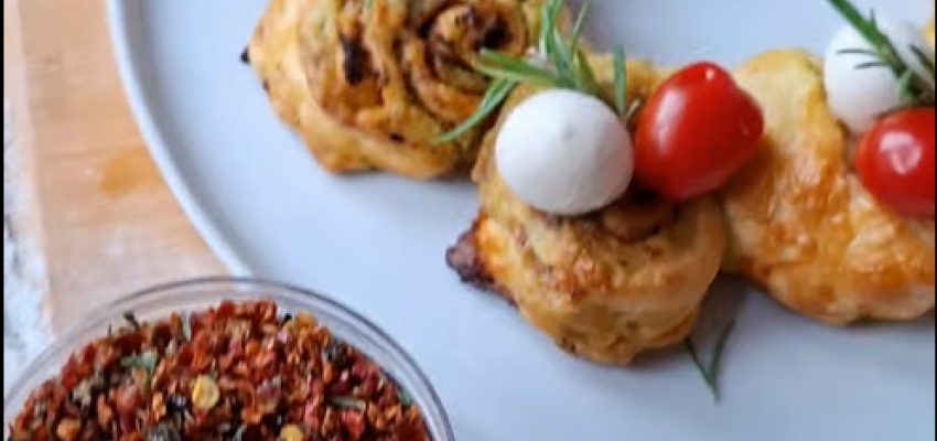 1 balení rozváleného listového těsta 3 lžíce bazalkového pesta Statek 2 lžíce pesta ze sušených rajčat Statek 50 g balkánského sýru 1 rozšlehané v…
