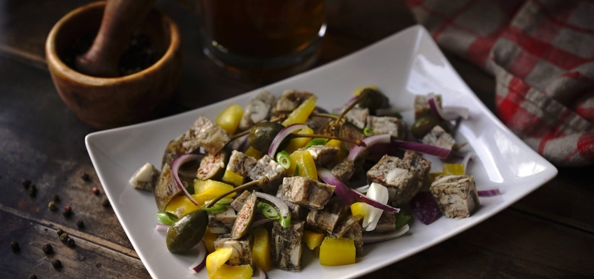 (2 porce) 3 plátky světlé tlačenky z Chovservis 1 čerstvá paprika 8 světlých kapar ½ červené cibule 2 jarní cibulky (zelená část) 2 lžíce sluneč…
