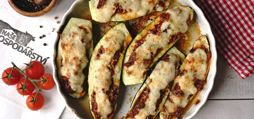 3 menší cukety Hovězí boloňská z Naše hospodářství sůl 1 lžíce másla 1/2 lžíce hladké mouky 200 ml mléka špetka muškátového oříšku 2 lžíce stro…