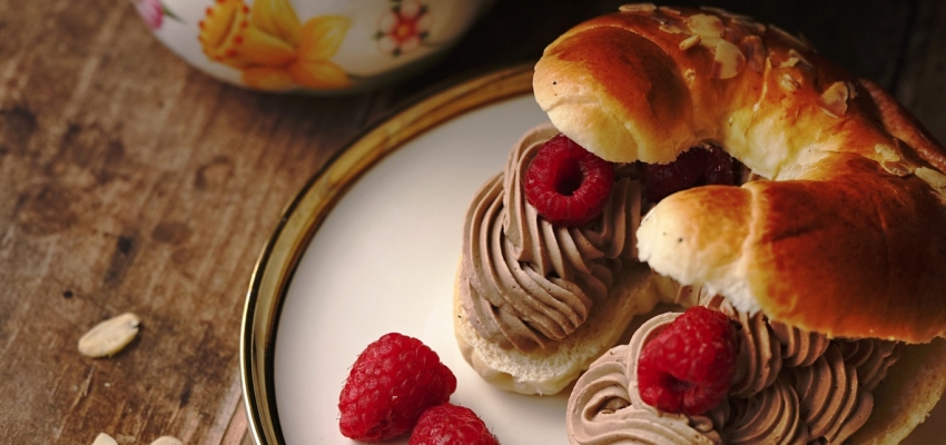 2 mandlové loupáky z V mouce 120 ml 40% smetany ke šlehání 3 lžíce lískooříškového pomazánkového krému (Nuty) čerstvé maliny Vyšlehejte smetanu ke…